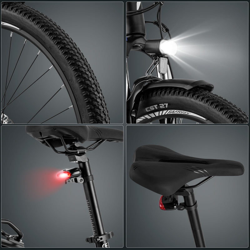 Zuversichtliche Kontrolle: Die griffigen CST 27,5×2,25"-Reifen, die hellen StVZO-Lichter und der ergonomische Ledersattel sorgen für Stabilität, Sichtbarkeit und Komfort bei jeder Fahrt.