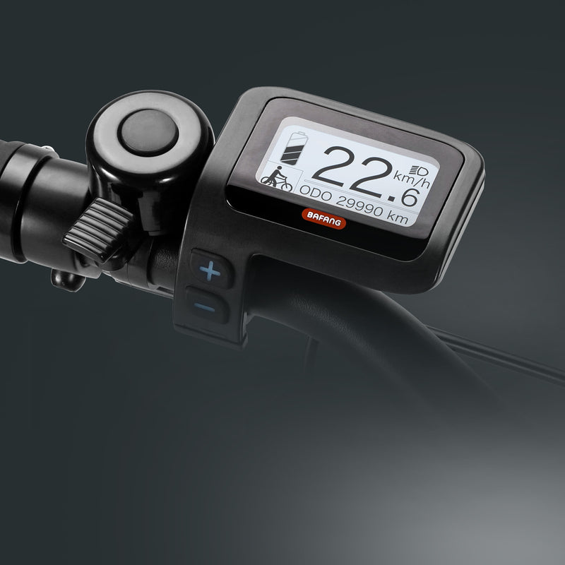 BAFANG Display: Kontrastreich und sonnenlichttauglich, zeigt es Geschwindigkeit, Unterstützungsgrad und Fahrdaten deutlich an und bietet 5 intuitive Unterstützungsmodi.