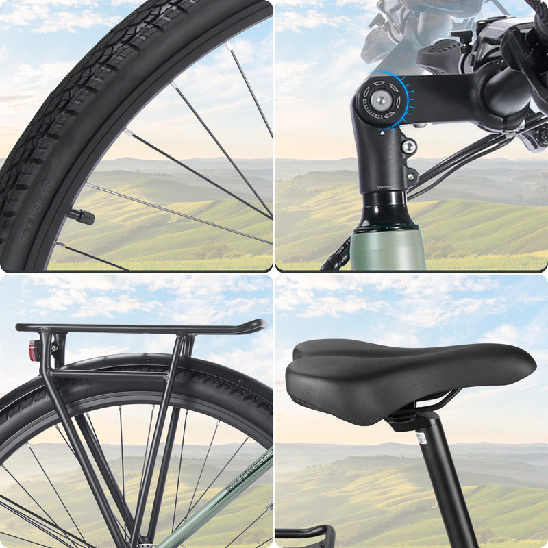 Selbstbewusstes Fahren: Die KENDA 700C-Reifen, der ergonomische Ledersattel und der verstellbare Vorbau garantieren Grip, Haltung und Komfort für den ganzen Tag.